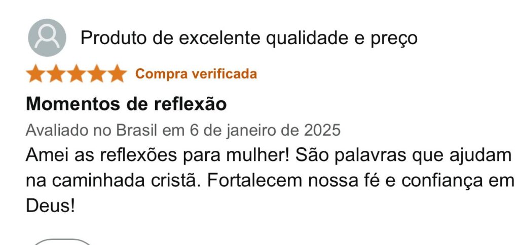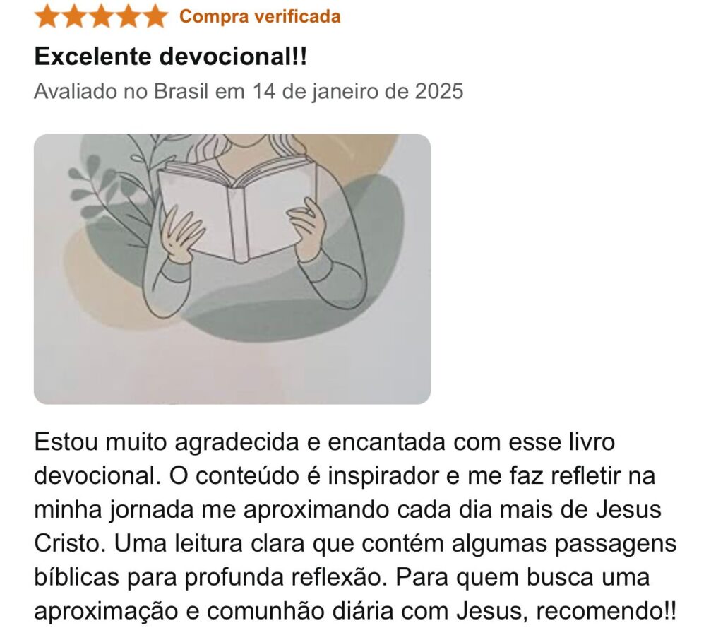 🔥 "Me trouxe paz em meio ao caos" "Com a correria do trabalho e da casa, me sentia exausta e sem tempo para cuidar da minha vida espiritual. Esse devocional foi um presente! Ele me ajuda a manter o foco no que realmente importa, me dá direcionamento e me fortalece emocionalmente. Sinto que estou mais calma, confiante e conectada com Deus!" 💖 — Renata F., 42 anos, Empresária e Mãe de Três